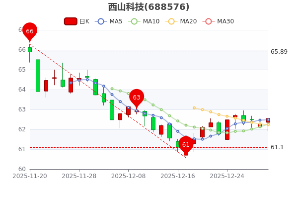 12月31日消息,西山科技5日内股价下跌0.37%,最新报62.550元,成交量14.62万手,总市值为28.46亿元。