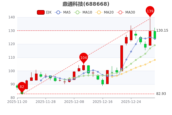 根据数据显示,鼎通科技股票在12月31日15时收盘跌4.33%,报价为124.000元。当日成交额达到8.64亿元,换手率4.92%,总市值为172.61亿元。