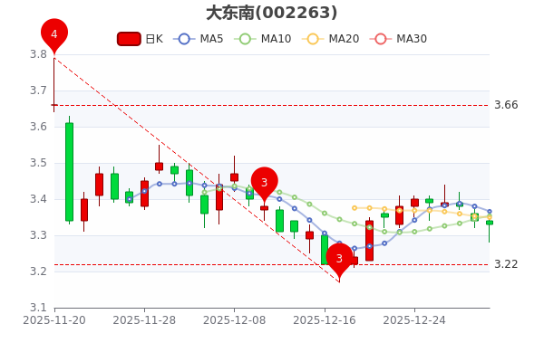 12月31日讯息,大东南3日内股价下跌1.5%,市值为62.55亿元,跌0.3%,最新报3.330元。