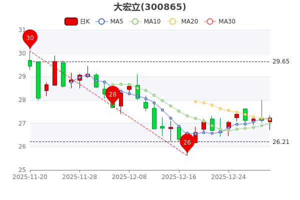 12月31日收盘消息,大宏立最新报价27.230元,3日内股价上涨0.15%,市盈率为-2288.24。