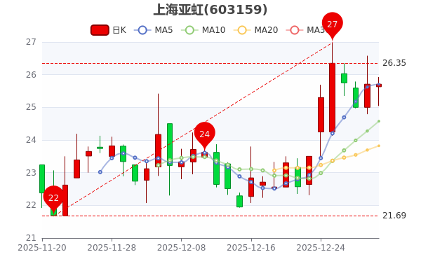12月30日收盘消息,上海亚虹开盘报价25元,收盘于25.710元。7日内股价上涨8.6%,总市值为35.99亿元。