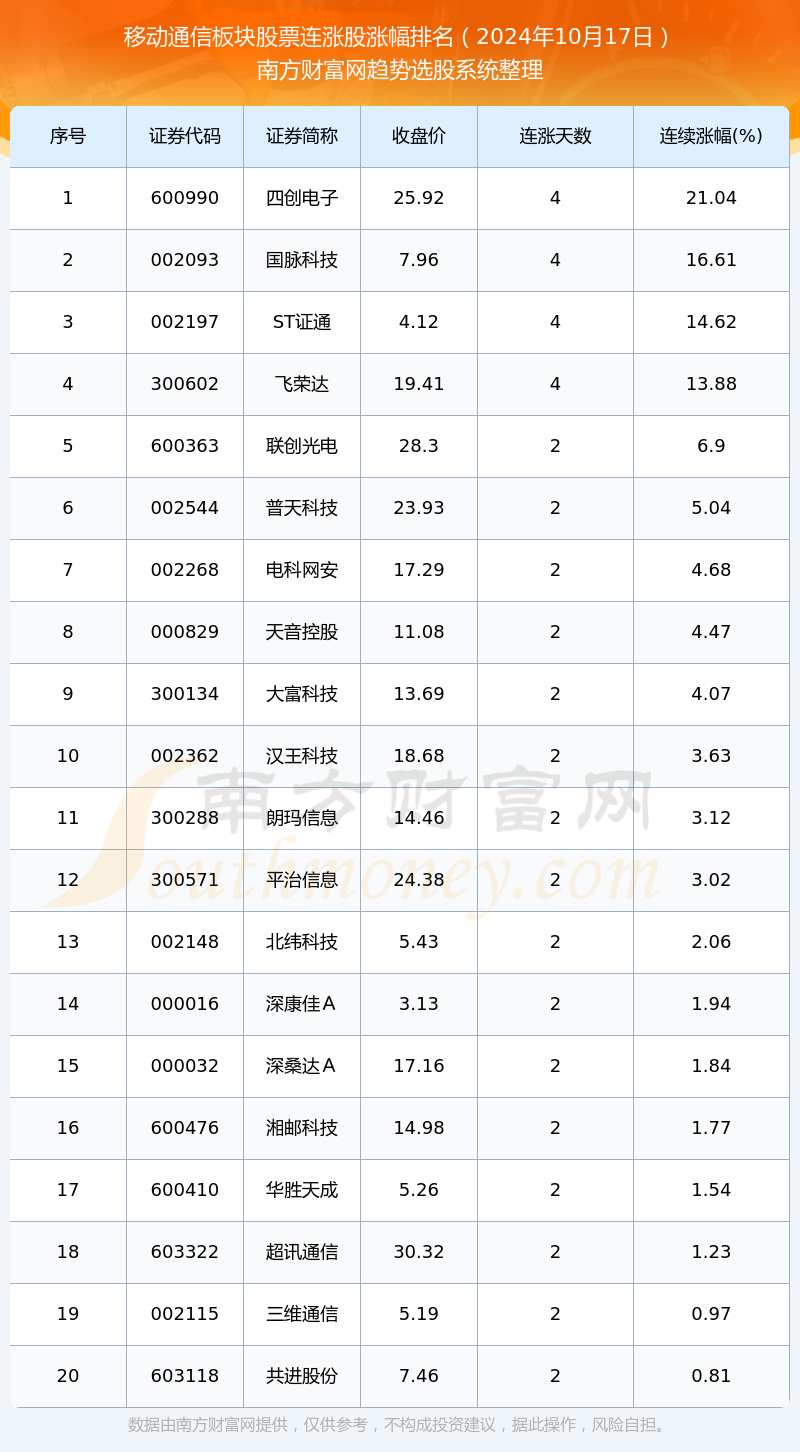今日移动通信板块股票连涨股一览表(2024年10月17日)