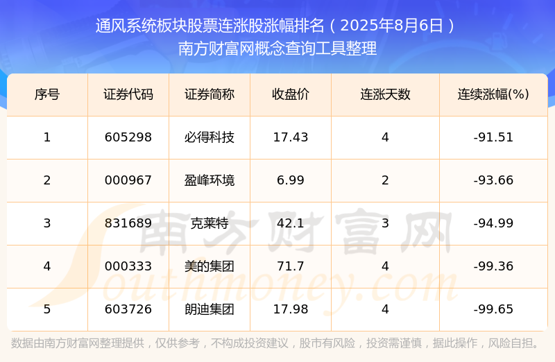 2025年8月6日通风系统板块股票连涨股涨幅排名