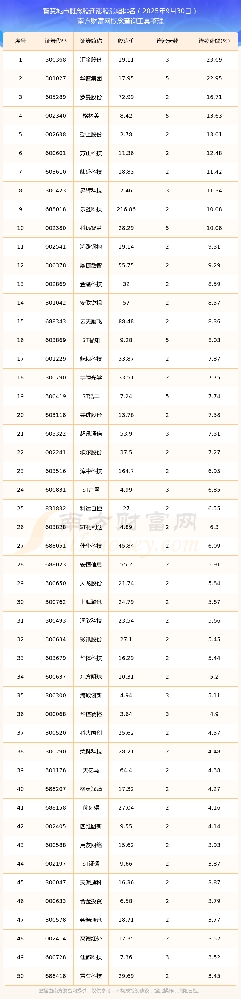 2025年9月30日智慧城市概念股连涨股涨幅排名