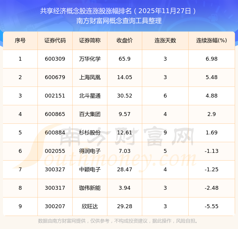 根据南方财富网概念查询工具数据统计,截止2025年11月27日收盘,共享经济概念股共有9只个股实现连涨。其中连续涨幅较大的个股有万华化学、上海凤凰、北斗星通等,连续涨幅分别为6.98%、5.48%、4.88%。