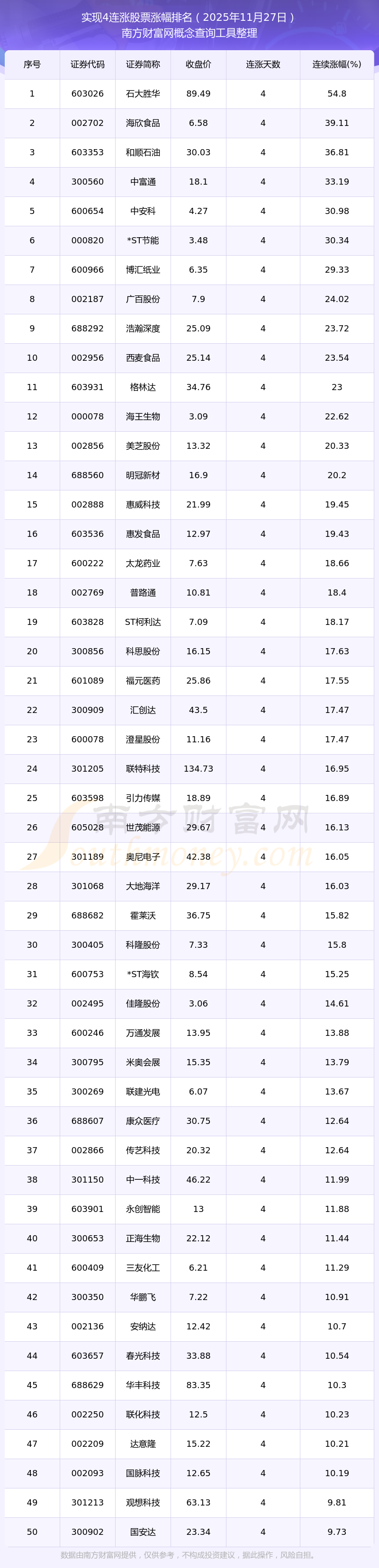 根据南方财富网概念查询工具数据统计,截止2025年11月27日收盘,共有209只个股实现4天连涨。其中连续涨幅较大的个股有石大胜华、海欣食品、和顺石油等,连续涨幅分别为54.80%、39.11%、36.81%。