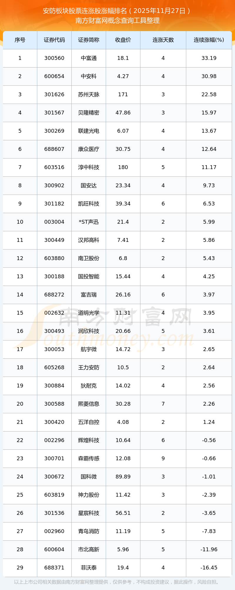 2025年11月27日安防板块股票连涨股票涨幅排名