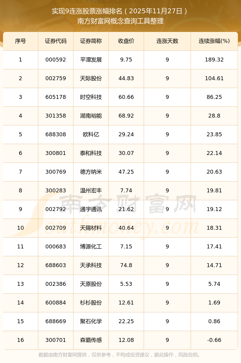 根据南方财富网概念查询工具数据统计,截止2025年11月27日收盘,共有16只个股实现9天连涨。其中连续涨幅较大的个股有平潭发展、天际股份、时空科技等,连续涨幅分别为189.32%、104.61%、86.25%。