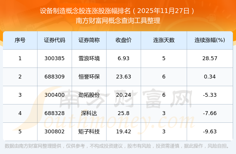 2025年11月27日设备制造概念股连涨股涨幅排名