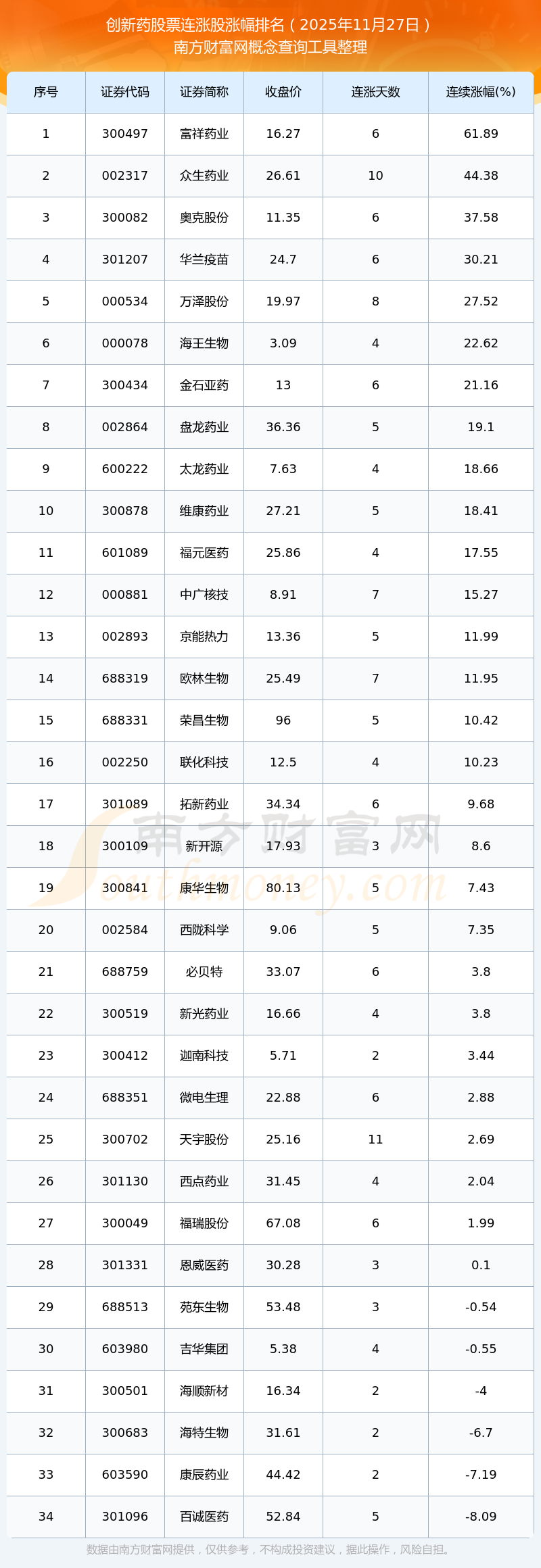 根据南方财富网概念查询工具数据统计,截止2025年11月27日收盘,创新药股票共有34只个股实现连涨。其中连续涨幅较大的个股有富祥药业、众生药业、奥克股份等,连续涨幅分别为61.89%、44.38%、37.58%。