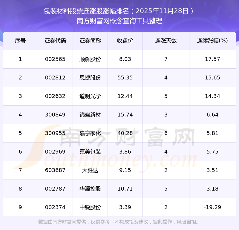 根据南方财富网概念查询工具数据统计,截止2025年11月28日收盘,包装材料股票共有9只个股实现连涨。其中连续涨幅较大的个股有顺灏股份、恩捷股份、道明光学等,连续涨幅分别为17.57%、15.65%、14.34%。