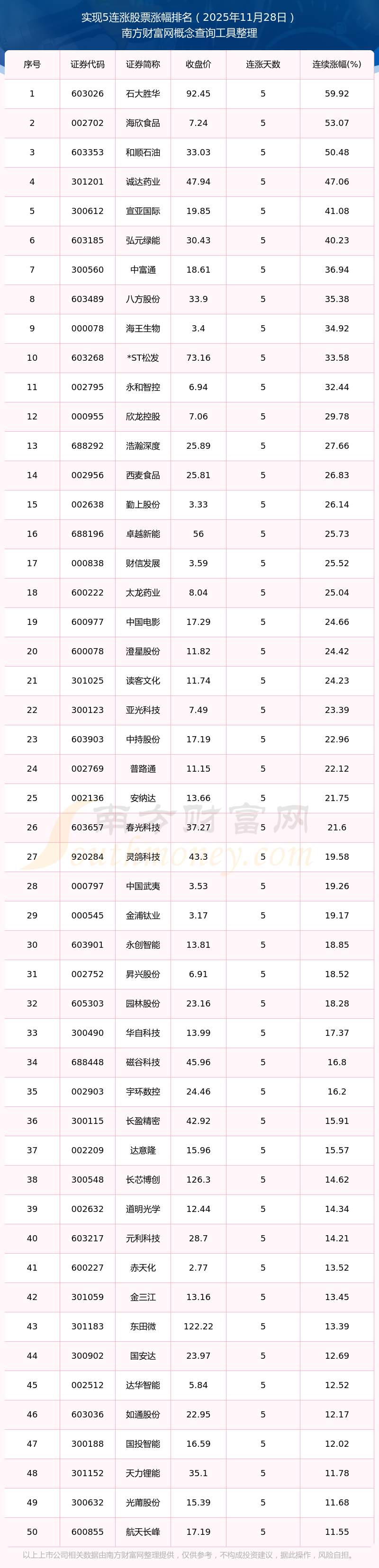 根据南方财富网概念查询工具数据统计,截止2025年11月28日收盘,共有131只个股实现5天连涨。其中连续涨幅较大的个股有石大胜华、海欣食品、和顺石油等,连续涨幅分别为59.92%、53.07%、50.48%。