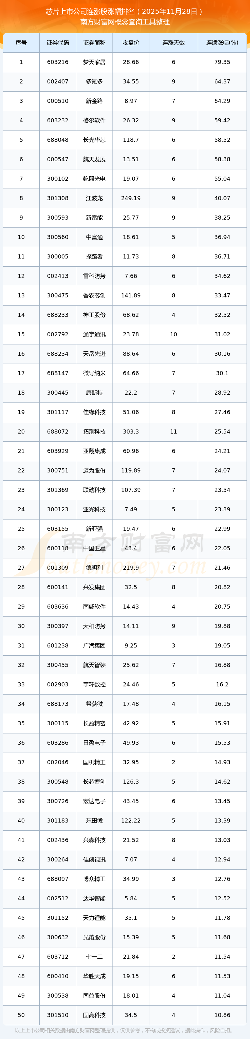2025年11月28日芯片上市公司连涨股涨幅排名