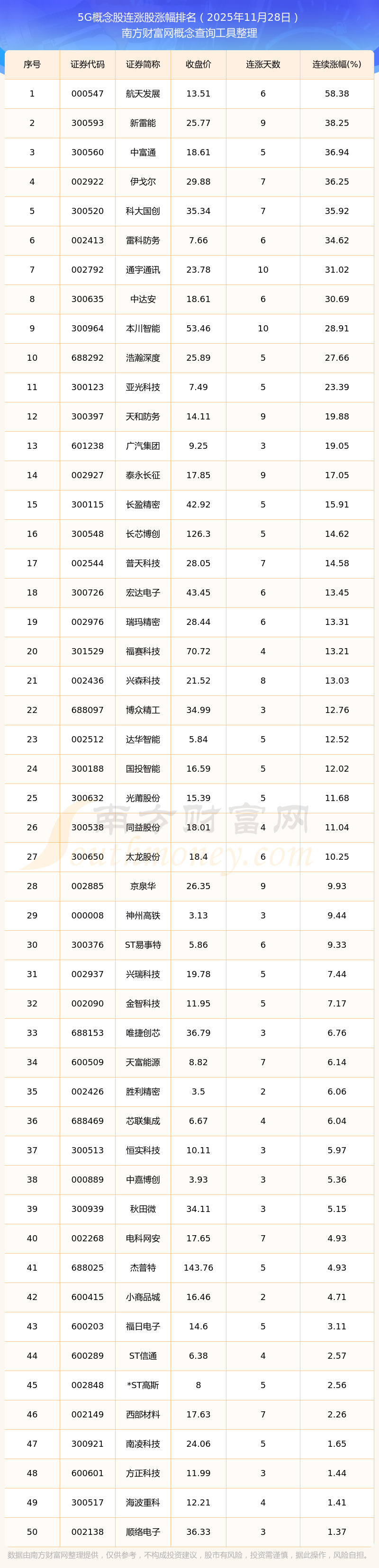 根据南方财富网概念查询工具数据统计,截止2025年11月28日收盘,5G概念股共有79只个股实现连涨。其中连续涨幅较大的个股有航天发展、新雷能、中富通等,连续涨幅分别为58.38%、38.25%、36.94%。