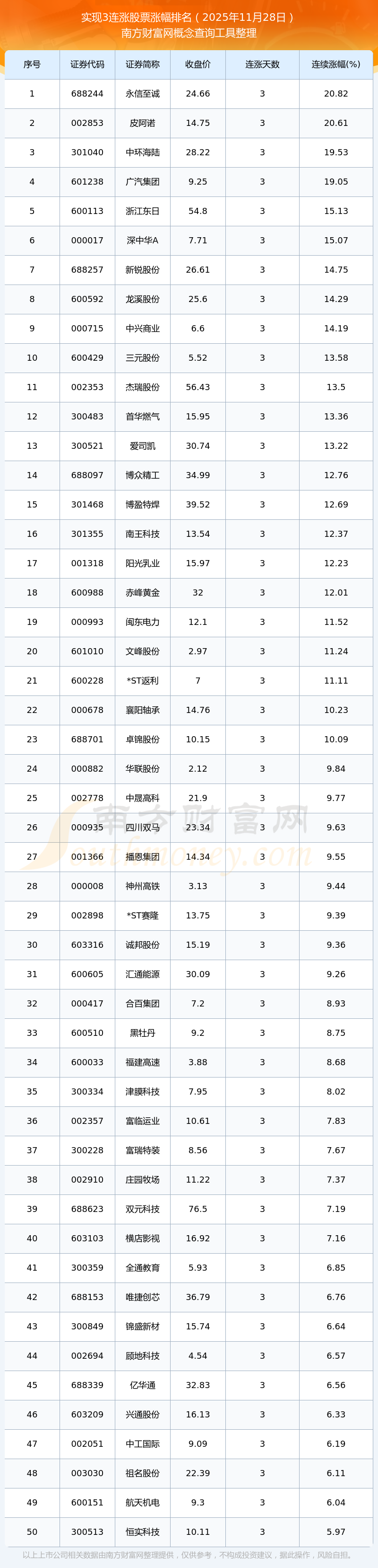根据南方财富网概念查询工具数据统计,截止2025年11月28日收盘,共有146只个股实现3天连涨。其中连续涨幅较大的个股有永信至诚、皮阿诺、中环海陆等,连续涨幅分别为20.82%、20.61%、19.53%。