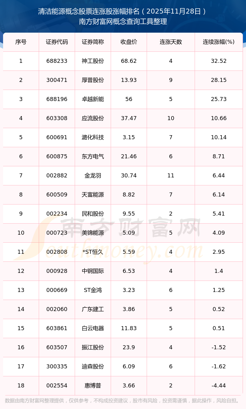 根据南方财富网概念查询工具数据统计,截止2025年11月28日收盘,清洁能源概念股票共有18只个股实现连涨。其中连续涨幅较大的个股有神工股份、厚普股份、卓越新能等,连续涨幅分别为32.52%、28.15%、25.73%。