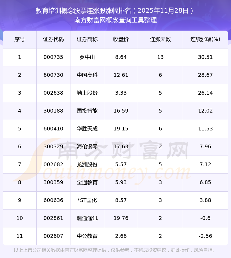 2025年11月28日教育培训概念股票连涨股涨幅排名