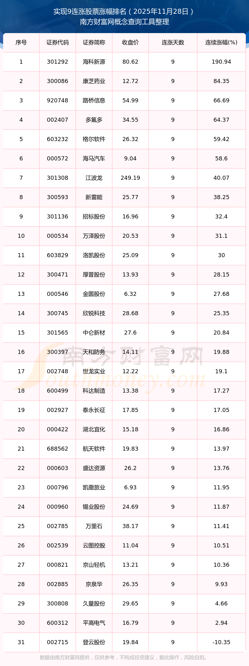 根据南方财富网概念查询工具数据统计,截止2025年11月28日收盘,共有31只个股实现9天连涨。其中连续涨幅较大的个股有海科新源、康芝药业、路桥信息等,连续涨幅分别为190.94%、84.35%、66.69%。