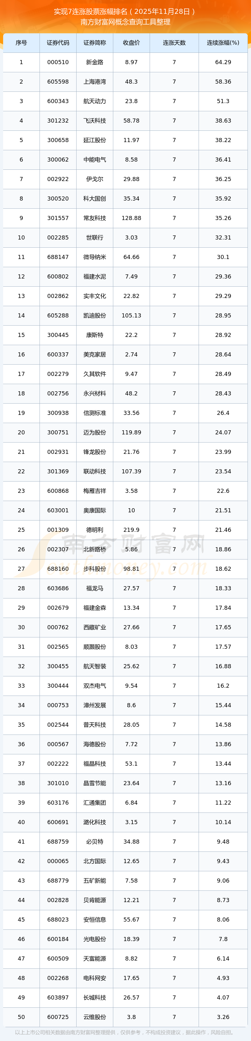 根据南方财富网概念查询工具数据统计,截止2025年11月28日收盘,共有57只个股实现7天连涨。其中连续涨幅较大的个股有新金路、上海港湾、航天动力等,连续涨幅分别为64.29%、58.36%、51.30%。