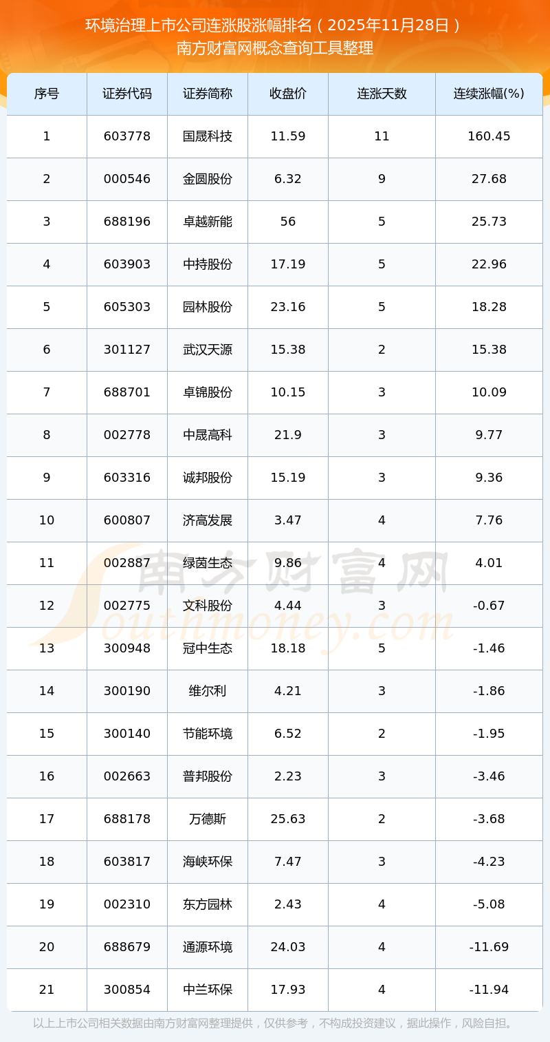 2025年11月28日环境治理上市公司连涨股票涨幅排名