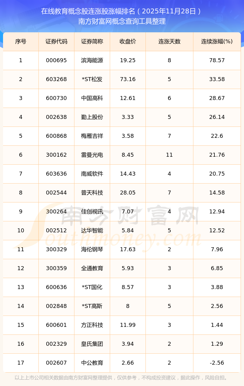 根据南方财富网概念查询工具数据统计,截止2025年11月28日收盘,在线教育概念股共有17只个股实现连涨。其中连续涨幅较大的个股有滨海能源、*ST松发、中国高科等,连续涨幅分别为78.57%、33.58%、28.67%。