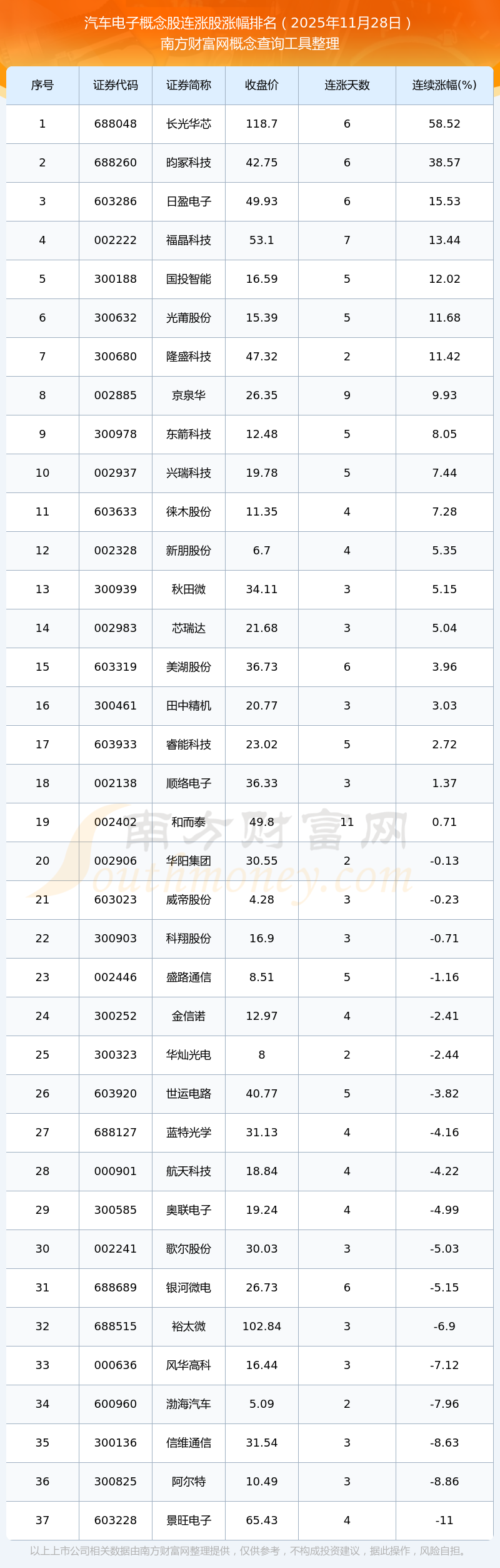 2025年11月28日汽车电子概念股连涨股涨幅排名