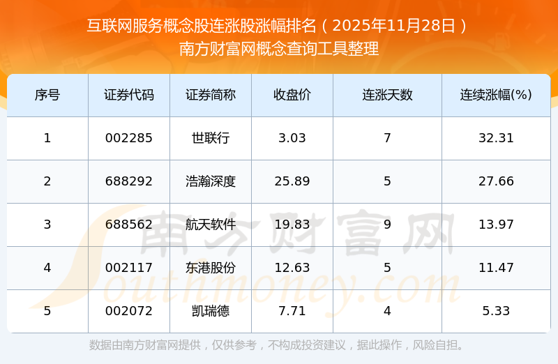 根据南方财富网概念查询工具数据统计,截止2025年11月28日收盘,互联网服务概念股共有5只个股实现连涨。其中连续涨幅较大的个股有世联行、浩瀚深度、航天软件等,连续涨幅分别为32.31%、27.66%、13.97%。