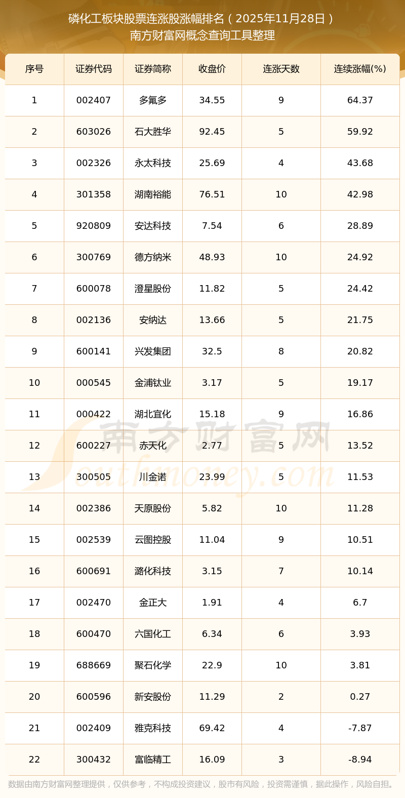 根据南方财富网概念查询工具数据统计,截止2025年11月28日收盘,磷化工板块股票共有22只个股实现连涨。其中连续涨幅较大的个股有多氟多、石大胜华、永太科技等,连续涨幅分别为64.37%、59.92%、43.68%。