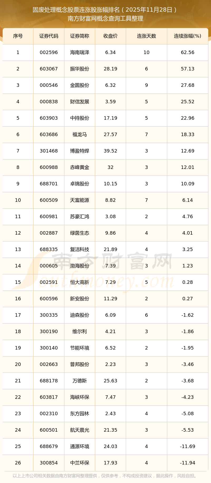 2025年11月28日固废处理概念股票连涨股涨幅排名