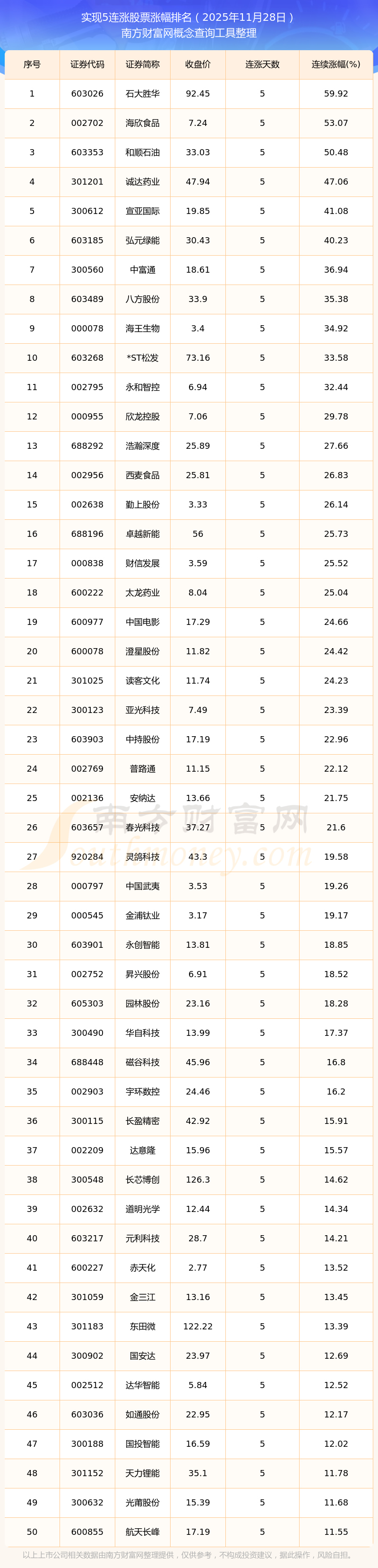 根据南方财富网概念查询工具数据统计,截止2025年11月28日收盘,共有131只个股实现5天连涨。其中连续涨幅较大的个股有石大胜华、海欣食品、和顺石油等,连续涨幅分别为59.92%、53.07%、50.48%。