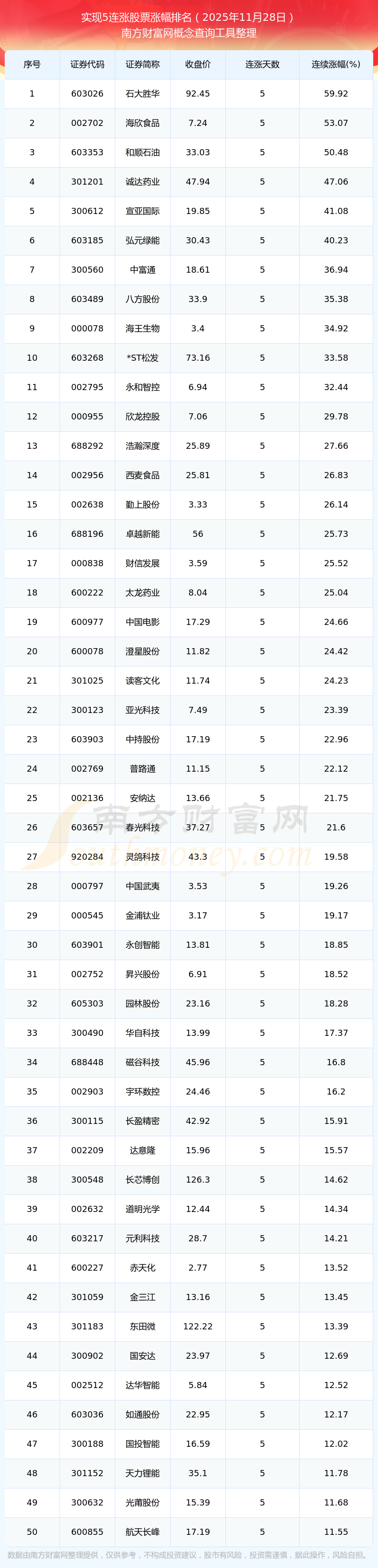 根据南方财富网概念查询工具数据统计,截止2025年11月28日收盘,共有131只个股实现5天连涨。其中连续涨幅较大的个股有石大胜华、海欣食品、和顺石油等,连续涨幅分别为59.92%、53.07%、50.48%。
