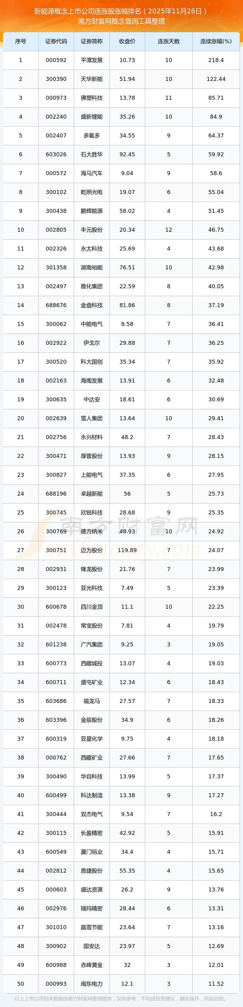 根据南方财富网概念查询工具数据统计,截止2025年11月28日收盘,新能源概念上市公司共有134只个股实现连涨。其中连续涨幅较大的个股有平潭发展、天华新能、佛塑科技等,连续涨幅分别为218.40%、122.44%、85.71%。