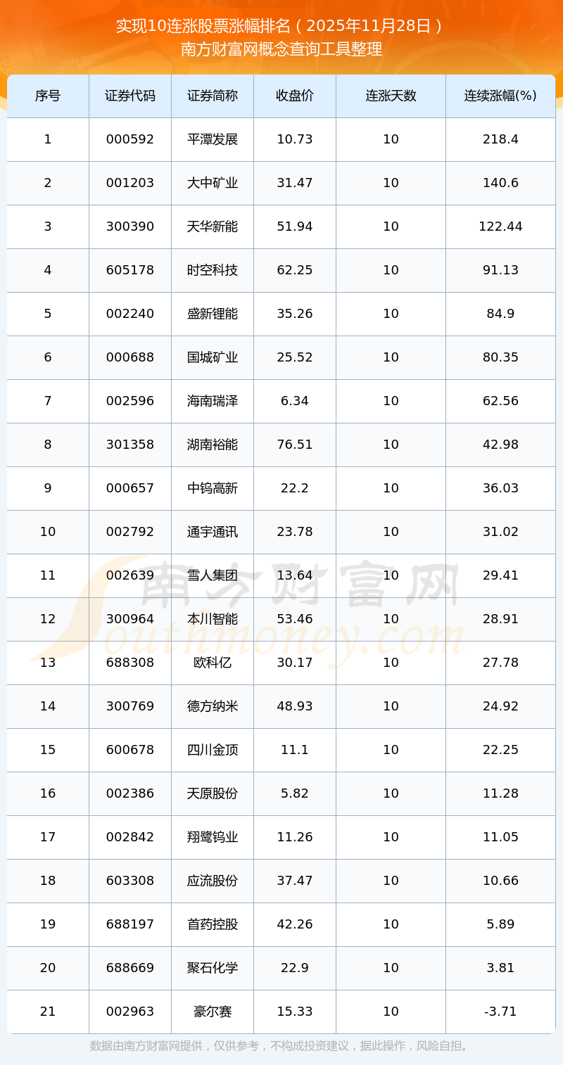【今日股市消息】2025年11月28日21只股票实现10连涨!