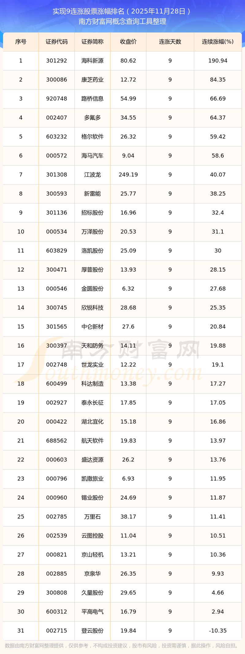 根据南方财富网概念查询工具数据统计,截止2025年11月28日收盘,共有31只个股实现9天连涨。其中连续涨幅较大的个股有海科新源、康芝药业、路桥信息等,连续涨幅分别为190.94%、84.35%、66.69%。