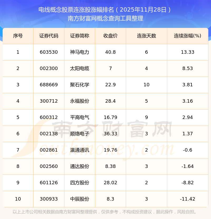 根据南方财富网概念查询工具数据统计,截止2025年11月28日收盘,电线概念股票共有10只个股实现连涨。其中连续涨幅较大的个股有神马电力、太阳电缆、聚石化学等,连续涨幅分别为13.33%、8.53%、3.81%。