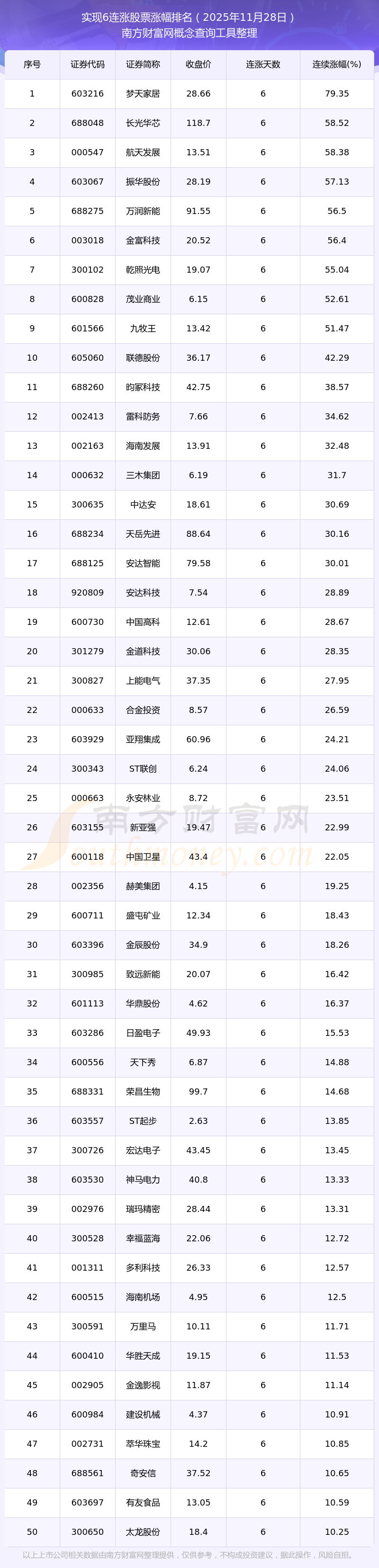 根据南方财富网概念查询工具数据统计,截止2025年11月28日收盘,共有85只个股实现6天连涨。其中连续涨幅较大的个股有梦天家居、长光华芯、航天发展等,连续涨幅分别为79.35%、58.52%、58.38%。