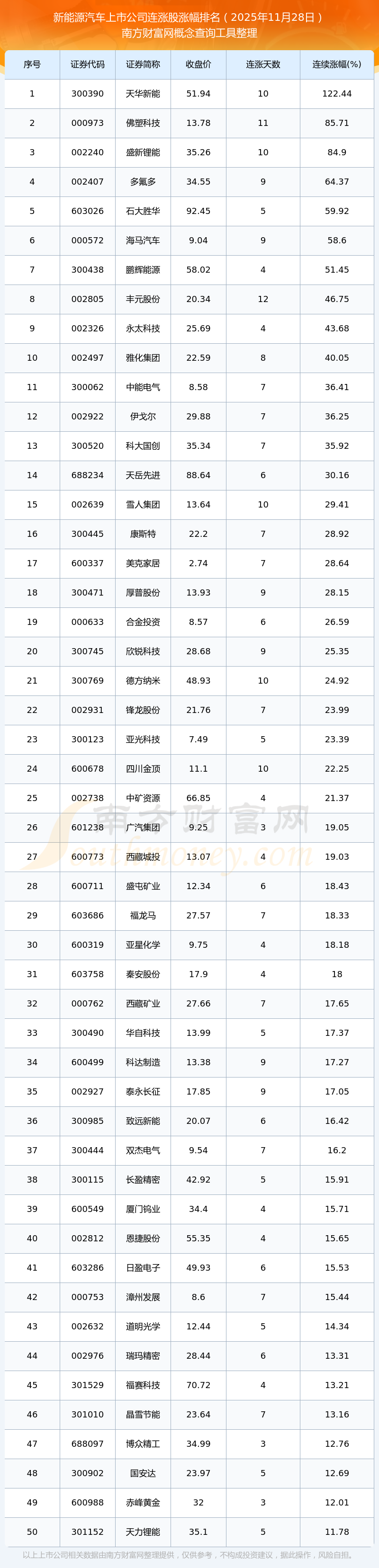 2025年11月28日新能源汽车上市公司连涨股涨幅排名