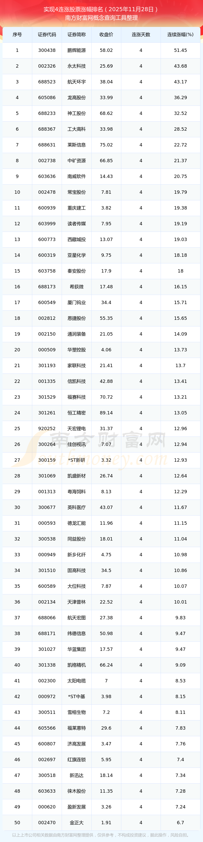 根据南方财富网概念查询工具数据统计,截止2025年11月28日收盘,共有137只个股实现4天连涨。其中连续涨幅较大的个股有鹏辉能源、永太科技、航天环宇等,连续涨幅分别为51.45%、43.68%、43.17%。