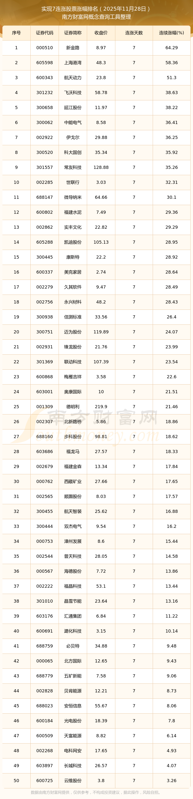 2025年11月28日实现7连涨股票涨幅排名