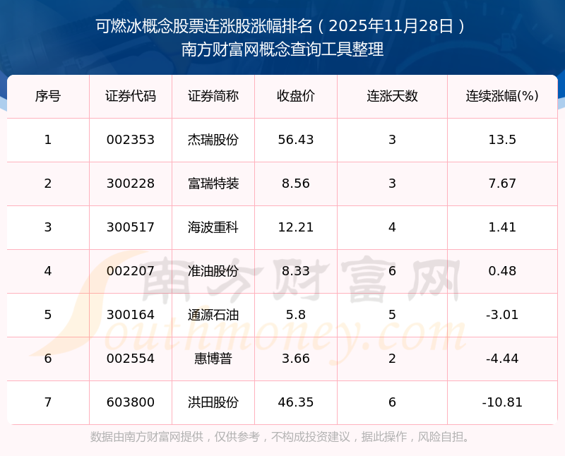 根据南方财富网概念查询工具数据统计,截止2025年11月28日收盘,可燃冰概念股票共有7只个股实现连涨。其中连续涨幅较大的个股有杰瑞股份、富瑞特装、海波重科等,连续涨幅分别为13.50%、7.67%、1.41%。