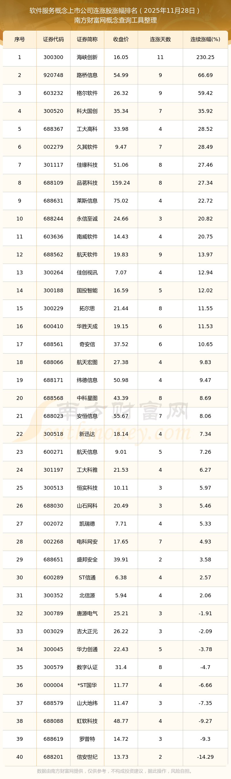 2025年11月28日软件服务概念上市公司连涨股涨幅排名