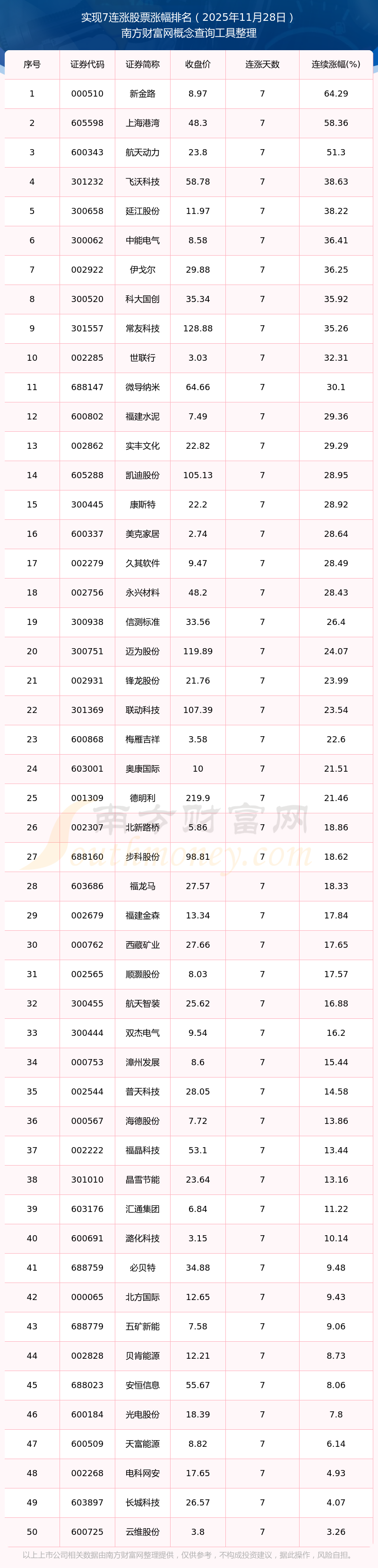根据南方财富网概念查询工具数据统计,截止2025年11月28日收盘,共有57只个股实现7天连涨。其中连续涨幅较大的个股有新金路、上海港湾、航天动力等,连续涨幅分别为64.29%、58.36%、51.30%。