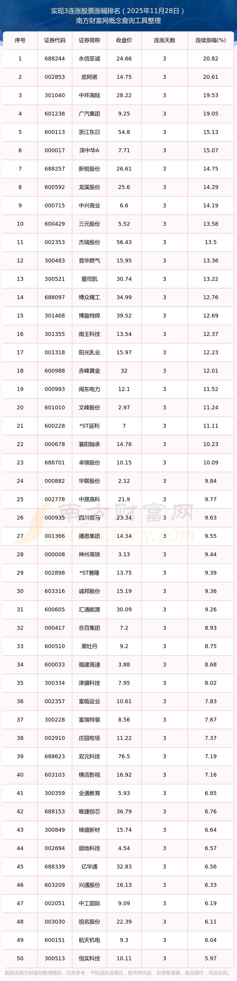 根据南方财富网概念查询工具数据统计,截止2025年11月28日收盘,共有146只个股实现3天连涨。其中连续涨幅较大的个股有永信至诚、皮阿诺、中环海陆等,连续涨幅分别为20.82%、20.61%、19.53%。