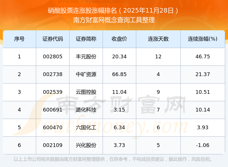 根据南方财富网概念查询工具数据统计,截止2025年11月28日收盘,硝酸股票共有6只个股实现连涨。其中连续涨幅较大的个股有丰元股份、中矿资源、云图控股等,连续涨幅分别为46.75%、21.37%、10.51%。