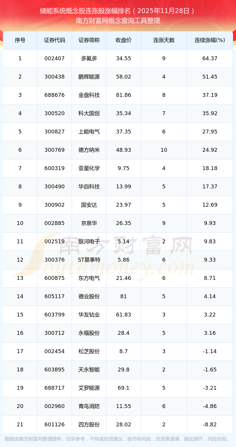 根据南方财富网概念查询工具数据统计,截止2025年11月28日收盘,储能系统概念股共有21只个股实现连涨。其中连续涨幅较大的个股有多氟多、鹏辉能源、金盘科技等,连续涨幅分别为64.37%、51.45%、37.19%。