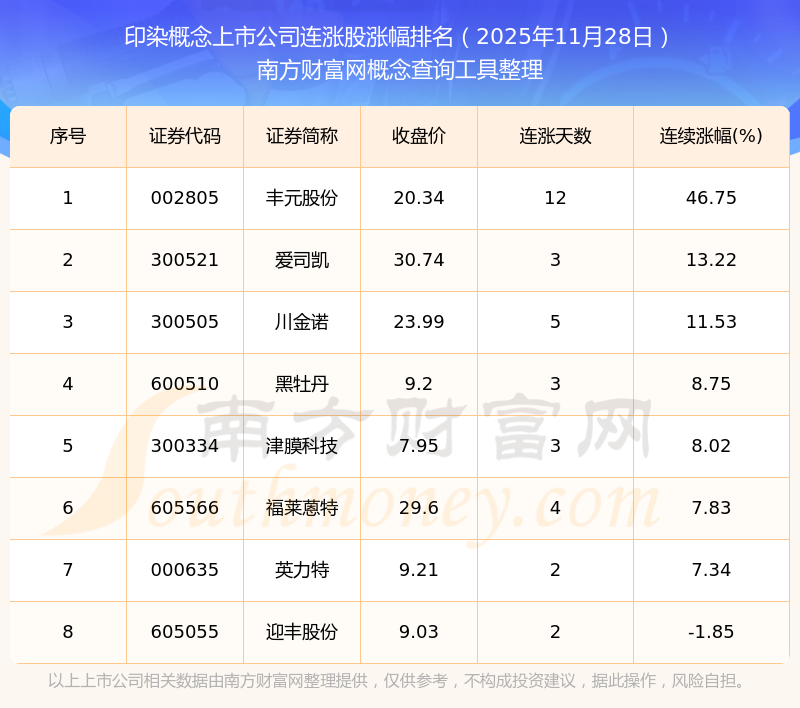 根据南方财富网概念查询工具数据统计,截止2025年11月28日收盘,印染概念上市公司共有8只个股实现连涨。其中连续涨幅较大的个股有丰元股份、爱司凯、川金诺等,连续涨幅分别为46.75%、13.22%、11.53%。