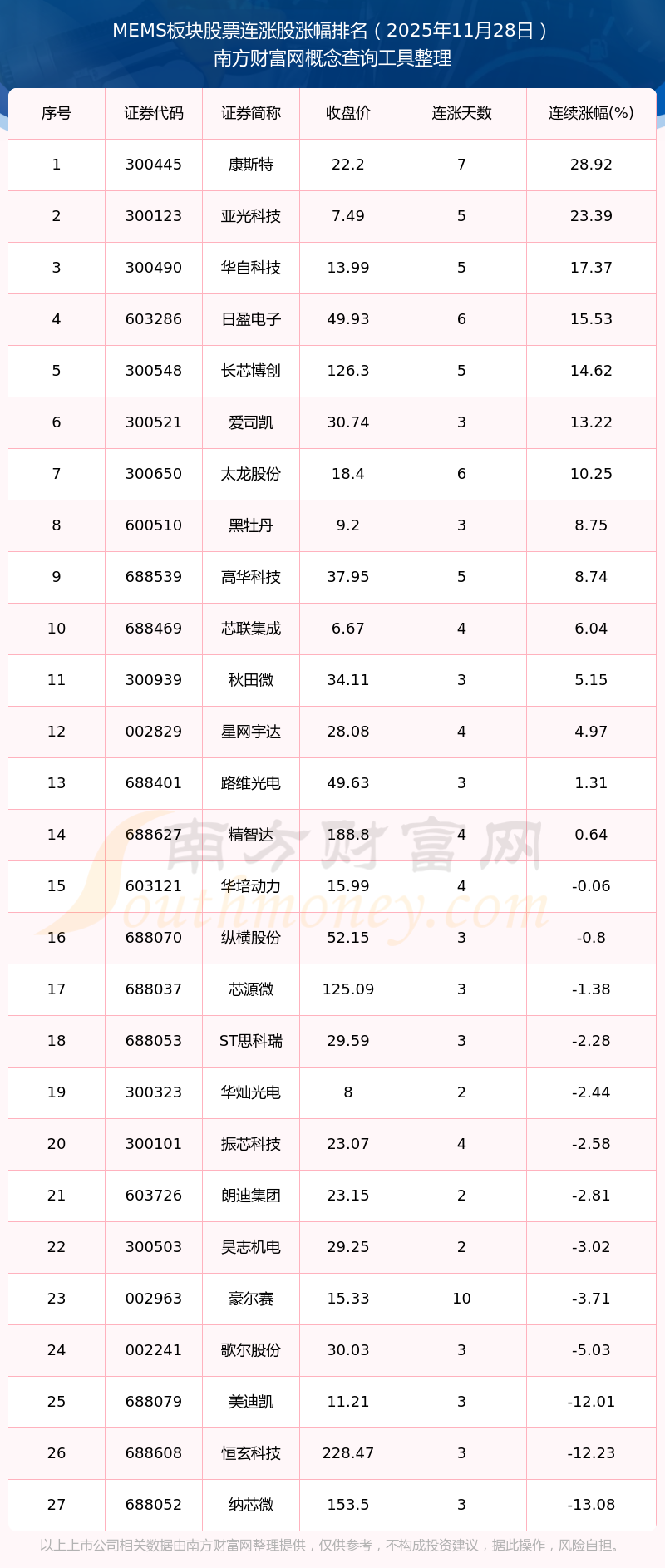 2025年11月28日MEMS板块股票连涨股票涨幅排名