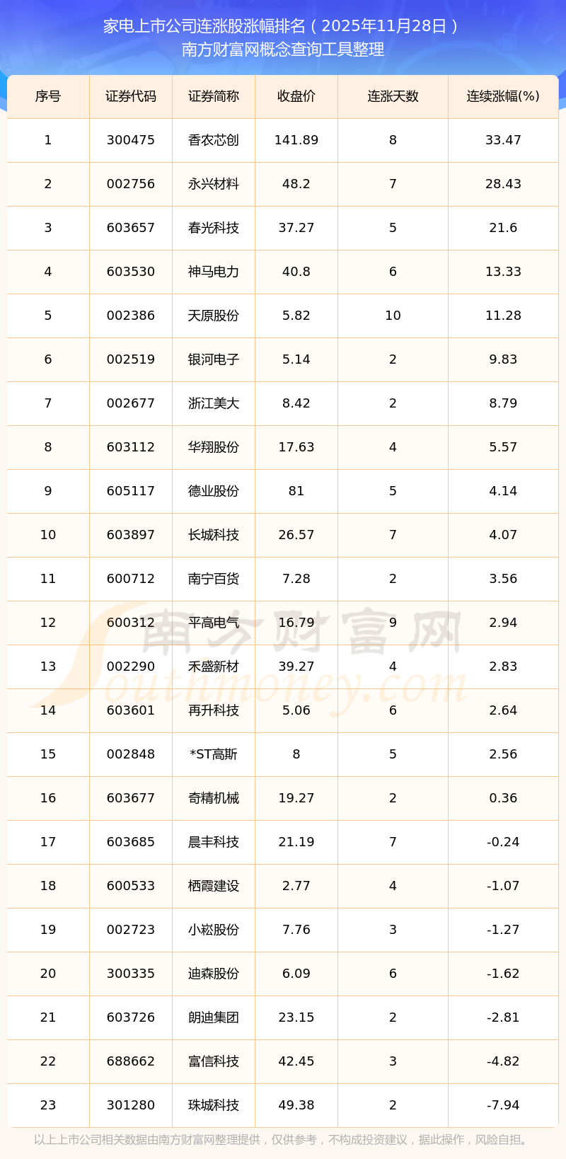 根据南方财富网概念查询工具数据统计,截止2025年11月28日收盘,家电上市公司共有23只个股实现连涨。其中连续涨幅较大的个股有香农芯创、永兴材料、春光科技等,连续涨幅分别为33.47%、28.43%、21.60%。