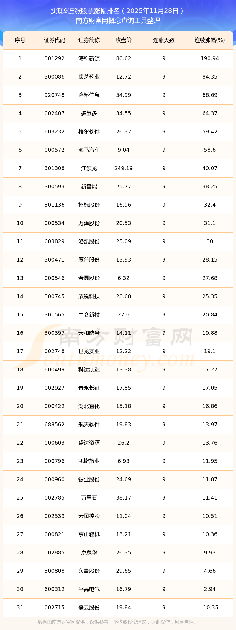 根据南方财富网概念查询工具数据统计,截止2025年11月28日收盘,共有31只个股实现9天连涨。其中连续涨幅较大的个股有海科新源、康芝药业、路桥信息等,连续涨幅分别为190.94%、84.35%、66.69%。
