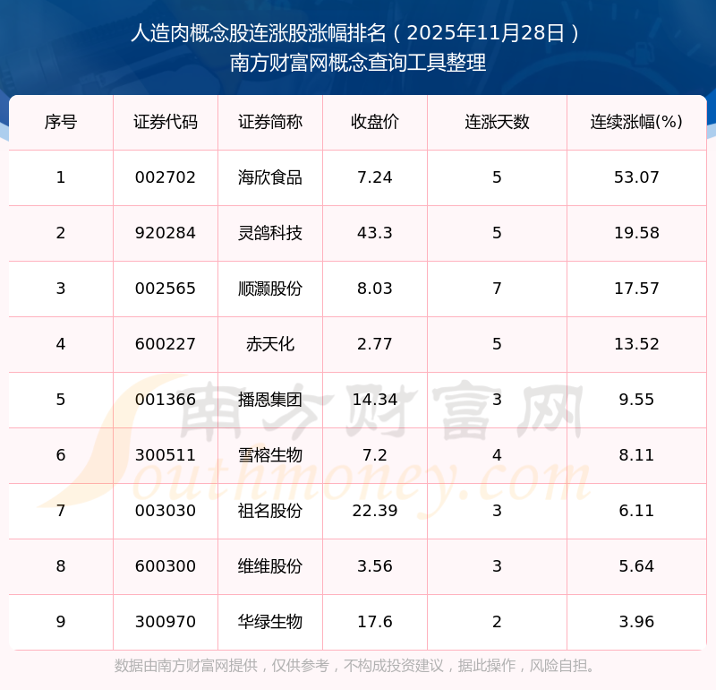 2025年11月28日人造肉概念股连涨股涨幅排名